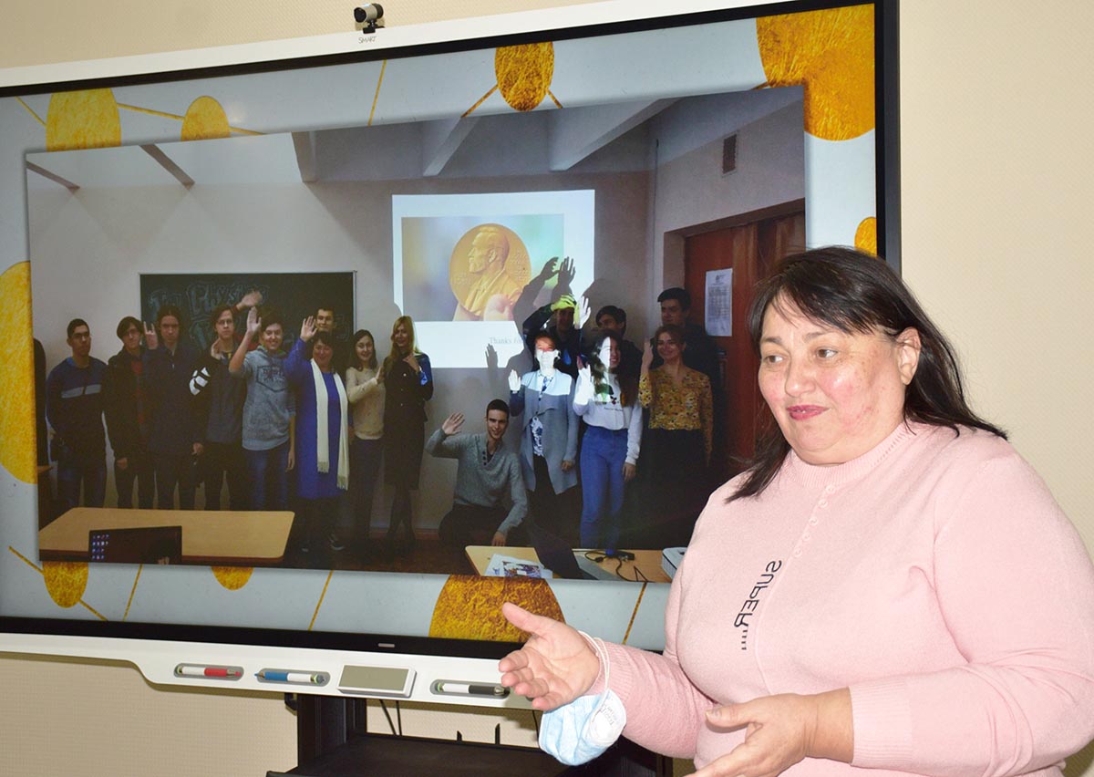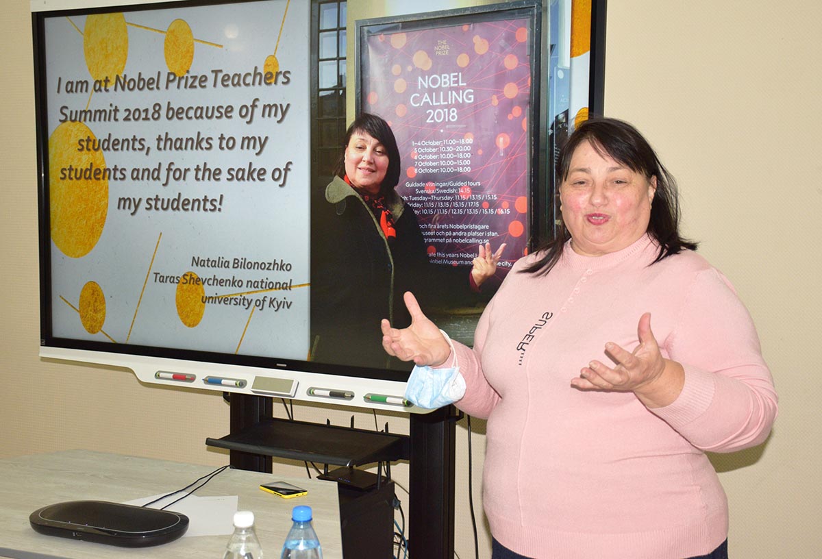 Подія за участі працівників, студентів і представників адміністрації Університету відбулася в головному навчальному корпусі 7 грудня 2021 року. Із вітальним словом до присутніх звернулася проректорка з науково-педагогічної роботи (гуманітарні питання) Інна Степанець, яка наголосила на важливості участі університетської спільноти в таких грандіозних подіях, як Nobel Prize Teacher Summit, поінформувала присутніх про університетські традиції організації подібних пізнавально-освітніх зустрічей і поділилася планами щодо подальшого розвитку цієї освітньої ініціативи в межах КНУ імені Тараса Шевченка. Унікальним досвідом безпосередньої участі в Саміті вчителів Нобелівської премії з присутніми поділилася кандидатка педагогічних наук, доцентка Навчально-наукового інституту філології КНУ Наталія Білоножко. Пані Білоножко розповіла, як у 2018 році їй вдалося налагодити професійні зв`язки з представниками Нобелівського комітету. Власне, викладачка відгукнулася на пропозицію завідувача кафедри іноземних мов хіміко-фізичних факультетів ННІФ КНУ Валентина Давидова, провела театралізований відкритий урок із використанням матеріалів Нобелівського комітету, за результатами заходу – її було запрошено в Стокгольм (Швеція) для участі в Nobel Prize Teacher Summit 2018. Учасники заходу обговорили ключові аспекти роботи поточного саміту, підключилися віртуально до урочистої церемонії відкриття цьогорічного Саміту вчителів Нобелівської премії, переказали учасникам із понад 300 країн вітання від усього колективу КНУ імені Тараса Шевченка й визначили подальші кроки для здобуття міжнародного визнання українських наукових здобутків. Наталія Білоножкозаохотила колег багато й плідно працювати задля розвитку університетської освіти та цілої України, а результати обговорень підсумувала словами представників освітнього департаменту Нобелівського комітету: «Ніхто не здатен змінювати світ. Але ми – викладачі. Ми можемо!».