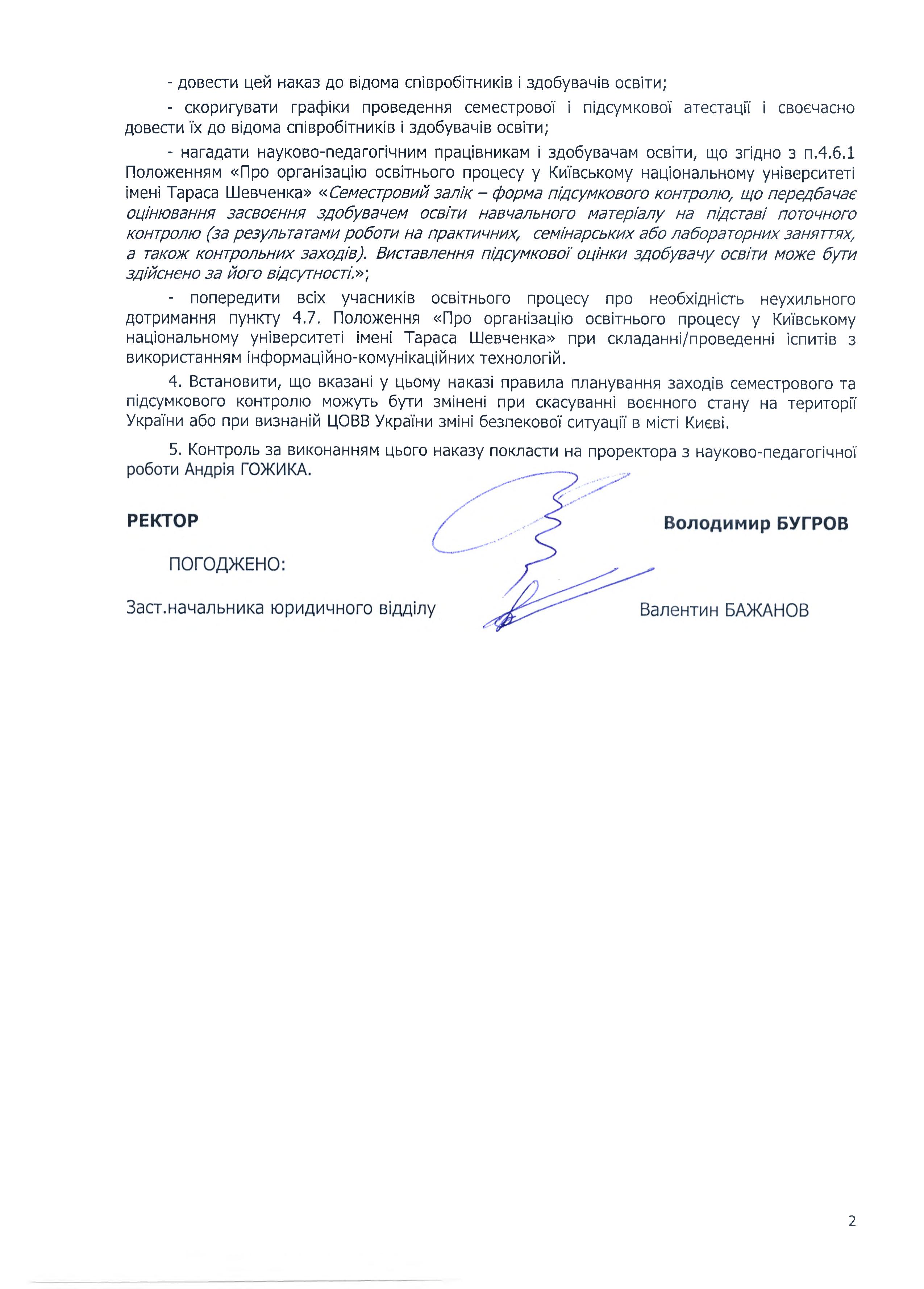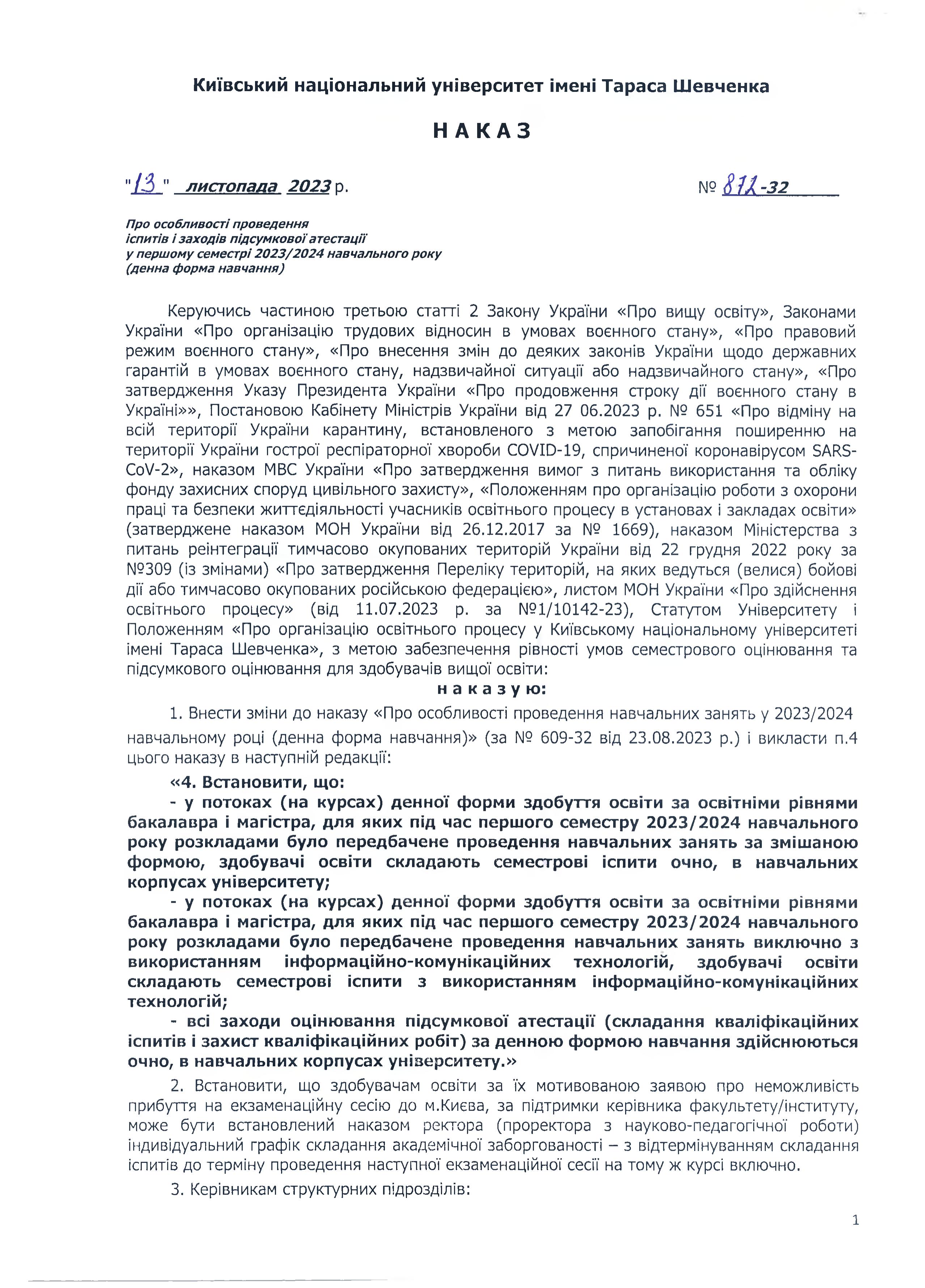 Керуючись частиною третьою статті 2 Закону України «Про вищу освіту», Законами України «Про організацію трудових відносин в умовах воєнного стану», «Про правовий режим воєнного стану», «Про внесення змін до деяких законів України щодо державних гарантій в умовах воєнного стану, надзвичайної ситуації або надзвичайного стану», «Про затвердження Указу Президента України «Про продовження строку дії воєнного стану в Україні»», Постановою Кабінету Міністрів України від 27 06.2023 р. № 651 «Про відміну на всій території України карантину, встановленого з метою запобігання поширенню на території України гострої респіраторної хвороби COVID-19, спричиненої коронавірусом SARS-CoV-2», наказом МВС України «Про затвердження вимог з питань використання та обліку фонду захисних споруд цивільного захисту», «Положенням про організацію роботи з охорони праці та безпеки життєдіяльності учасників освітнього процесу в установах і закладах освіти» (затверджене наказом МОН України від 26.12.2017 за № 1669), наказом Міністерства з питань реінтеграції тимчасово окупованих територій України від 22 грудня 2022 року за №309 (зі змінами) «Про затвердження Переліку територій, на яких ведуться (велися) бойові дії або тимчасово окупованих російською федерацією», листом МОН України «Про здійснення освітнього процесу» (від 11.07.2023 р. за №1/10142-23), Статутом Університету і Положенням «Про організацію освітнього процесу у Київському національному університеті імені Тараса Шевченка», з метою забезпечення рівності умов семестрового оцінювання та підсумкового оцінювання для здобувачів вищої освіти ухвалено рішення (наказ ректора № 872-32 від 13.11.2023 р.)