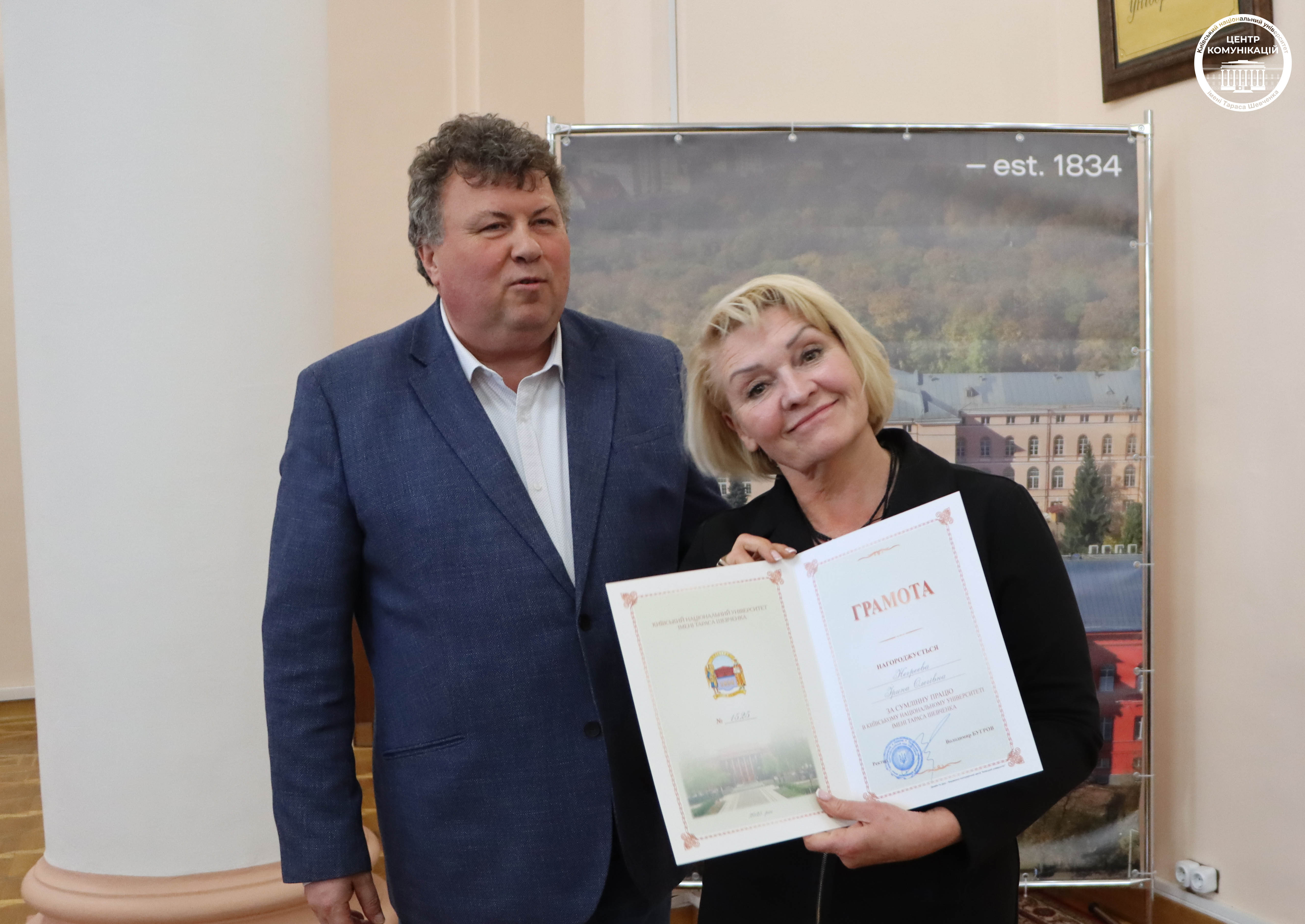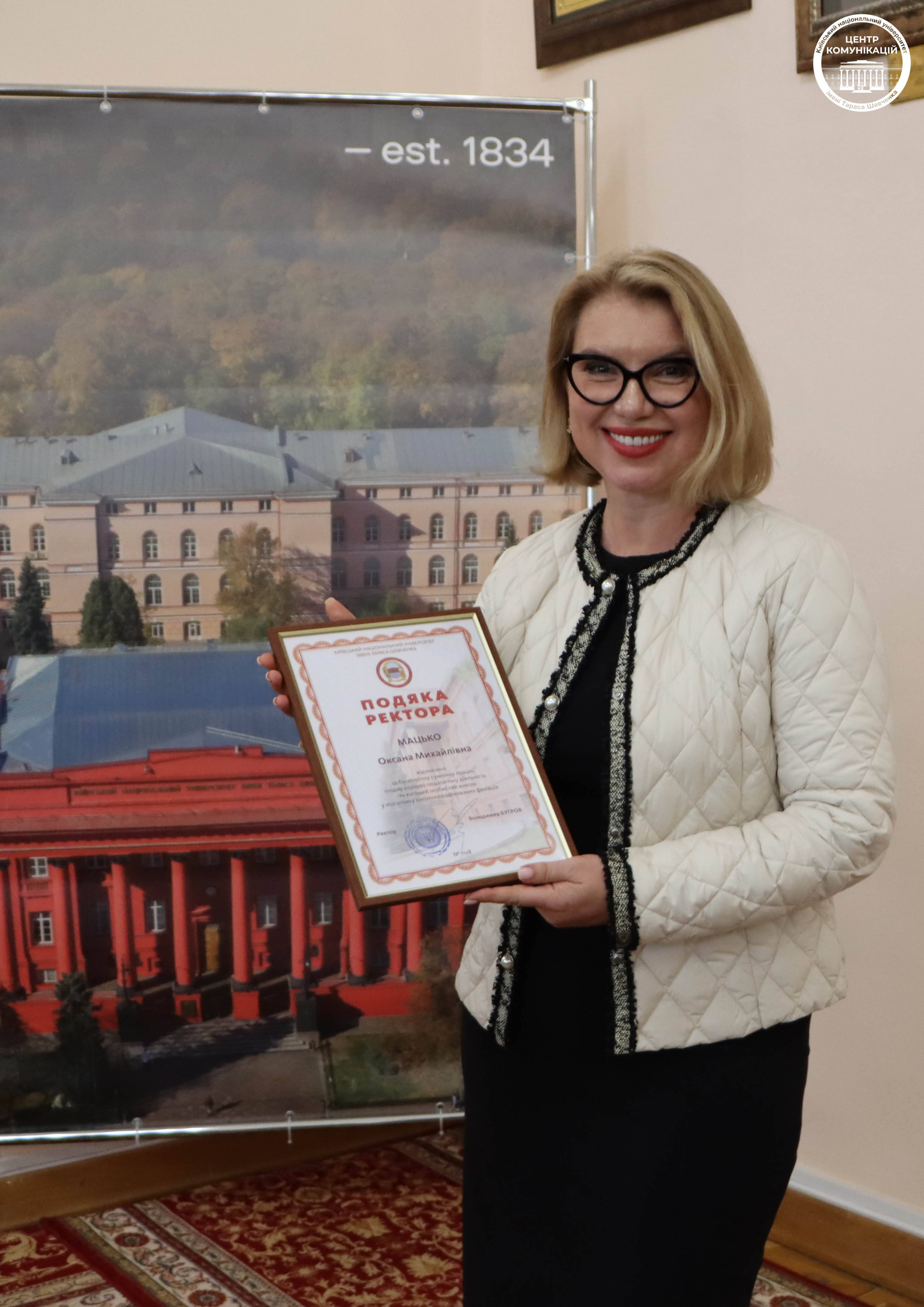 Подяку ректора КНУ отримала Оксана Мацько, доцентка кафедри української мови та прикладної лінгвістики ННІФ.