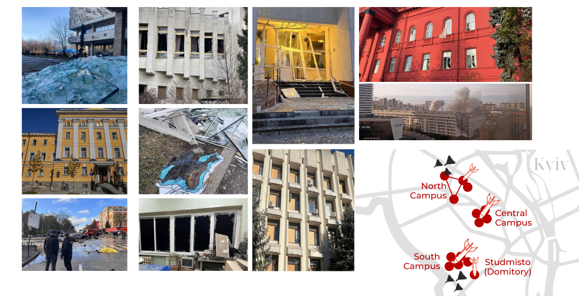 Довідково: З початку широкомасштабного вторгнення російської федерації в Україну внаслідок ворожих обстрілів зазнали пошкоджень приміщення низки підрозділів Київського національного університету імені Тараса Шевченка. Зокрема, у березні 2022 року постраждали корпуси Навчально-наукового інституту міжнародних відносин та Навчально-наукового інституту журналістики (ще раз 3 листопада 2024 року), Навчально-наукового інституту публічного управління та державної служби (обидві будівлі) та Факультету інформаційних технологій. 10 жовтня 2022 року – Головний (Червоний) навчальний корпус, будівлі Навчально-наукового інституту філології, Наукової бібліотеки імені М. Максимовича та частково Хімічного факультету, а також оранжереї Ботанічного саду імені О. В. Фоміна. 31 грудня 2022 року – Науково-навчальний центр «Інститут біології та медицини», Навчально-науковий інститут високих технологій, корпуси факультетів психології, географічного, соціології, комп’ютерних наук та кібернетики, радіофізики, електроніки та комп’ютерних систем, а також механіко-математичного факультету. Руйнувань зазнали лабораторний корпус, кафедра ядерної фізики та кріогенний комплекс Фізичного факультету, Спортивний комплекс, кілька гуртожитків та Український фізико-математичний ліцей. 25 травня 2025 року від ворожого БПЛА постраждали 3 гуртожитки Студмістечка. Відділення Оптико-механічного фахового коледжу в місті Ізюм (Харківська область) знищено повністю. Центр комунікацій |
