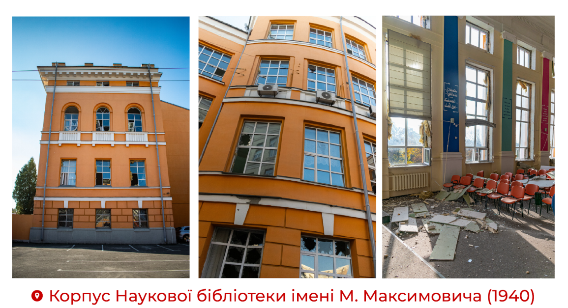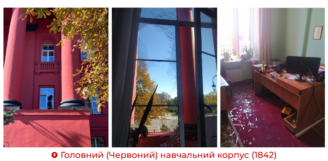 10 жовтня 2022 року кадри пожеж і руйнувань, спричинених масованим ракетним обстрілом Києва, облетіли весь світ. Країна-терорист ударила по середмістю столиці близько 8:20 ранку – саме тоді, коли кияни поспішали на роботу. Одна з російських ракет влучила у перехрестя вулиці Володимирської та бульвару Тараса Шевченка, де завжди людно у години пік. Тоді загинули троє людей: аспірант ННІ ПУДС КНУ, начальник відділу департаменту Кіберполіції Юрій Заскока, співробітниця АТ «Укртелеком» Любов Авраменко та лікарка-гематолог «Охматдиту» Оксана Леонтьєва. Ще одна ракета впала в парку Тараса Шевченка, утворивши вирву просто на дитячому майданчику. На щастя, тоді ніхто не постраждав. Вибуховою хвилею було пошкоджено кілька національних музеїв, культурних і освітніх установ, пам’ятки архітектури. Лише дивом і завдяки захисному каркасу, встановленому благодійниками з ініціативи одного з випускників КНУ, уцілів пам’ятник Кобзареві, який опинився майже в епіцентрі атаки. Від обстрілу постраждали кілька історичних будівель Університету: Головний (Червоний) корпус (1842 р.), корпус Навчально-наукового інституту філології (1852 р.), Наукова бібліотека імені М. Максимовича (1940 р.) і частково Хімічний факультет (1905 р.). Було пошкоджено Зоологічний музей КНУ – один із найстаріших у країні, а також оранжерею Ботанічного саду імені Олександра Фоміна, де зберігається унікальна колекція тропічних і субтропічних рослин, деякі з яких пережили навіть дві світові війни. Знімки розтрощених вікон і меблів одного з найстаріших університетів України стали доказом воєнних злочинів росії, а для університетської спільноти – символом незламності. Навіть після атаки Університет не припинив роботу. Працівники, студенти, волонтери й небайдужі громадяни відразу взялися розчищати пошкоджені приміщення. «Переходимо на дистанційку і працюємо на Перемогу! Все буде Україна», – написав того дня у Facebook ректор Володимир Бугров. Унаслідок ворожої ракетної атаки було вибито близько 1000 кв. м дверей, пошкоджено стелі та стіни, понад 3000 кв. м вікон залишилися без шибок. Особливо постраждала Наукова бібліотека імені М. Максимовича. Її співробітники та студенти різних підрозділів рятували унікальні фонди: очищали книжки від скла та пилу, переносили стародруки з аварійних приміщень у вцілілі. Люди ставали вервечкою й передавали цінні фоліанти з рук у руки – аби зберегти безцінну пам’ять і дух Університету. На першочергові відновлювальні роботи уряд виділив 15 млн грн із резервного фонду державного бюджету. Ці кошти було спрямовано на відновлення вікон у будівлях Головного корпусу, Наукової бібліотеки імені М. Максимовича та Хімічного факультету. Складність робіт полягала в тому, що всі ці споруди мають статус пам’яток архітектури, тож кожен етап вимагав не лише будівельних дозволів, а й погоджень від фахівців пам’яткоохоронної справи. На заклик керівництва КНУ про допомогу відгукнулися студенти, працівники, випускники, міжнародні партнери і просто небайдужі, які переказували на відновлення будівель від кількох до десятків тисяч гривень. Завдяки спільним зусиллям до грудня Університет відновив майже всі пошкодженні вікна. У Жовтому корпусі 500 пошкоджених вікон засклили коштом уряду Туреччини. У межах угоди між КНУ та Турецьким агентством зі співробітництва та координа