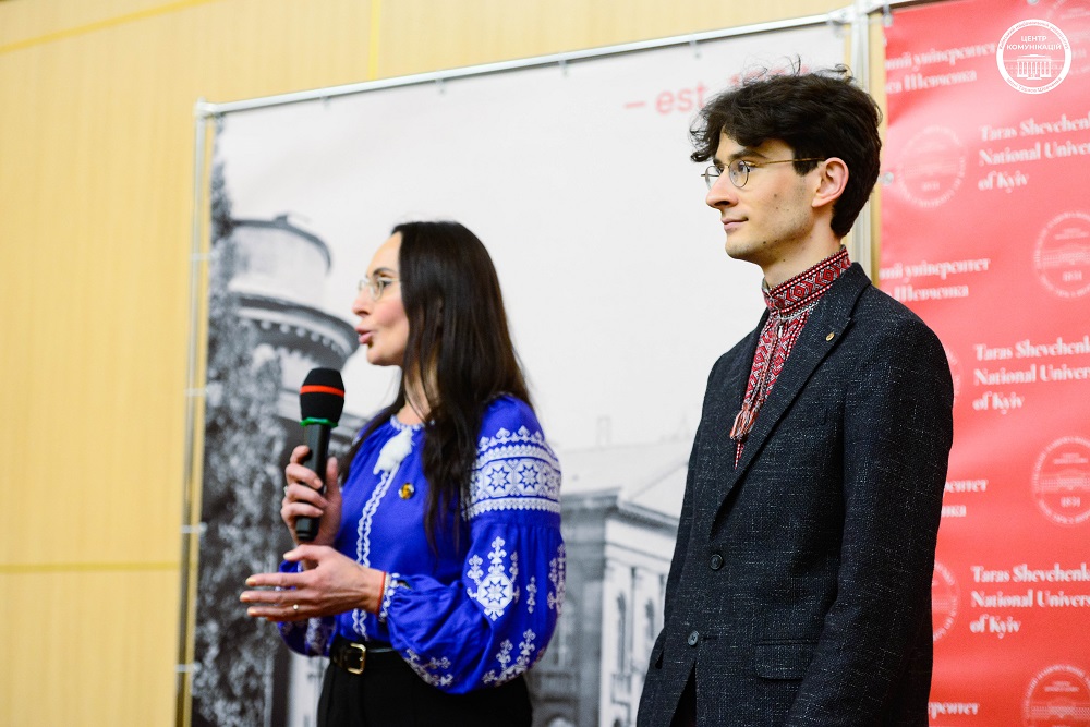 Далі відбулася презентація авторки та виконавиці диктанту від експертів ННІ філології КНУ – професорки Оксани Сліпушко та аспіранта Антіна Іщука. За словами експертів, текст цьогоріч писала українська авторка Євгенія Кузнєцова, книга «Драбина» якої була визнана книгою року ВВС – 2023. Читати диктант довірили народній артистці України, актрисі, яку за радянських часів вважали «білою вороною» за її українськість, – Наталії Сумській.