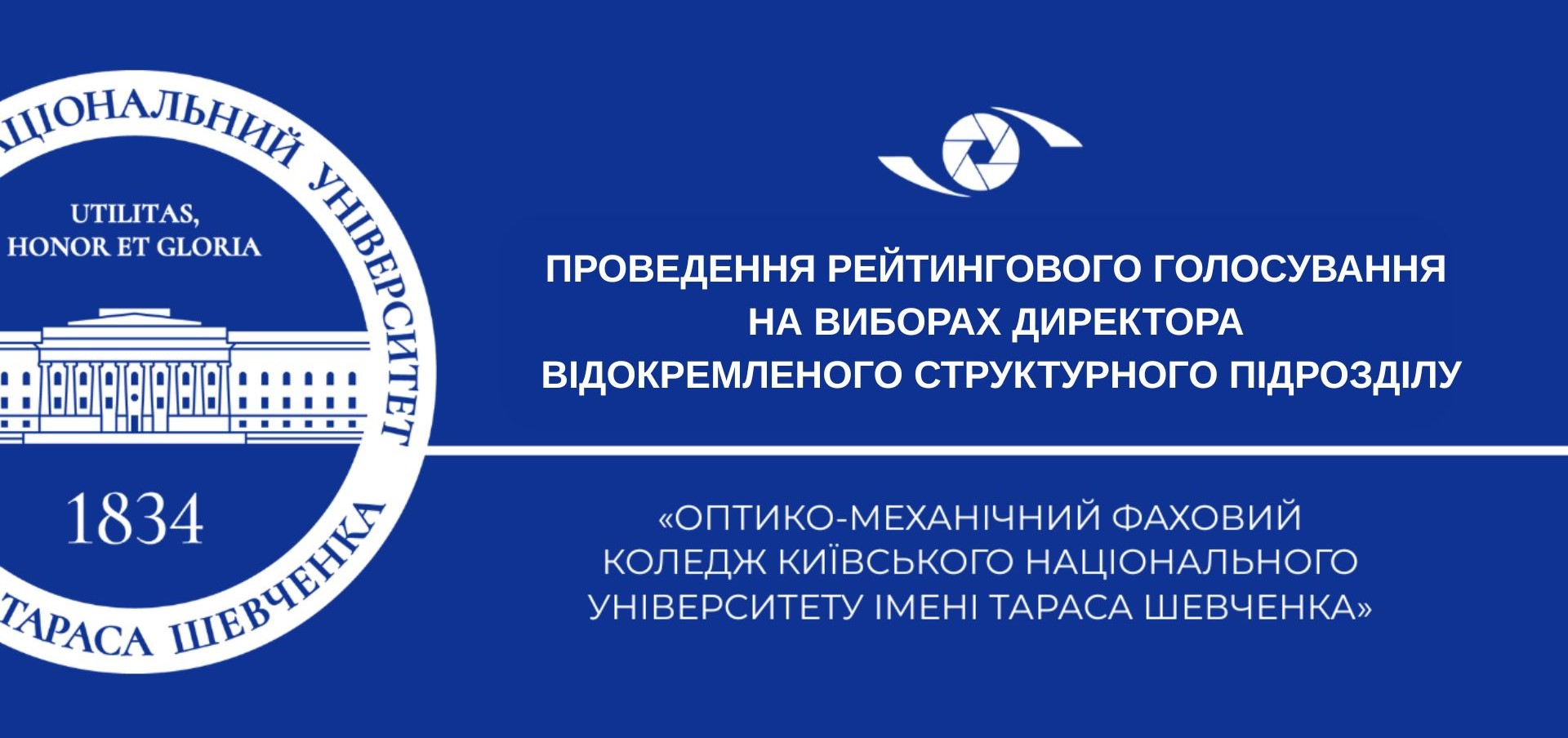 Відповідно до статті 42 Закону України «Про фахову передвищу освіту», Положення про конкурсний відбір на посаду директора фахового коледжу Київського національного університету імені Тараса Шевченка, схваленого Вченою радою Університету 16 червня 2025 року (протокол № 13), та наказів ректора № 547-32 від 16.06.2025 року і № 780-32 від 17.09.2025 року, оголошено проведення рейтингового голосування на виборах директора Відокремленого структурного підрозділу «Оптико-механічний фаховий коледж Київського національного університету імені Тараса Шевченка».