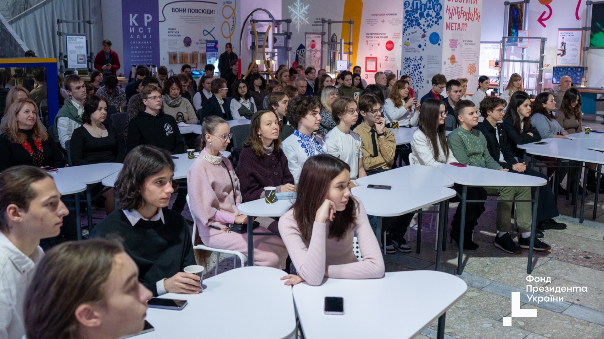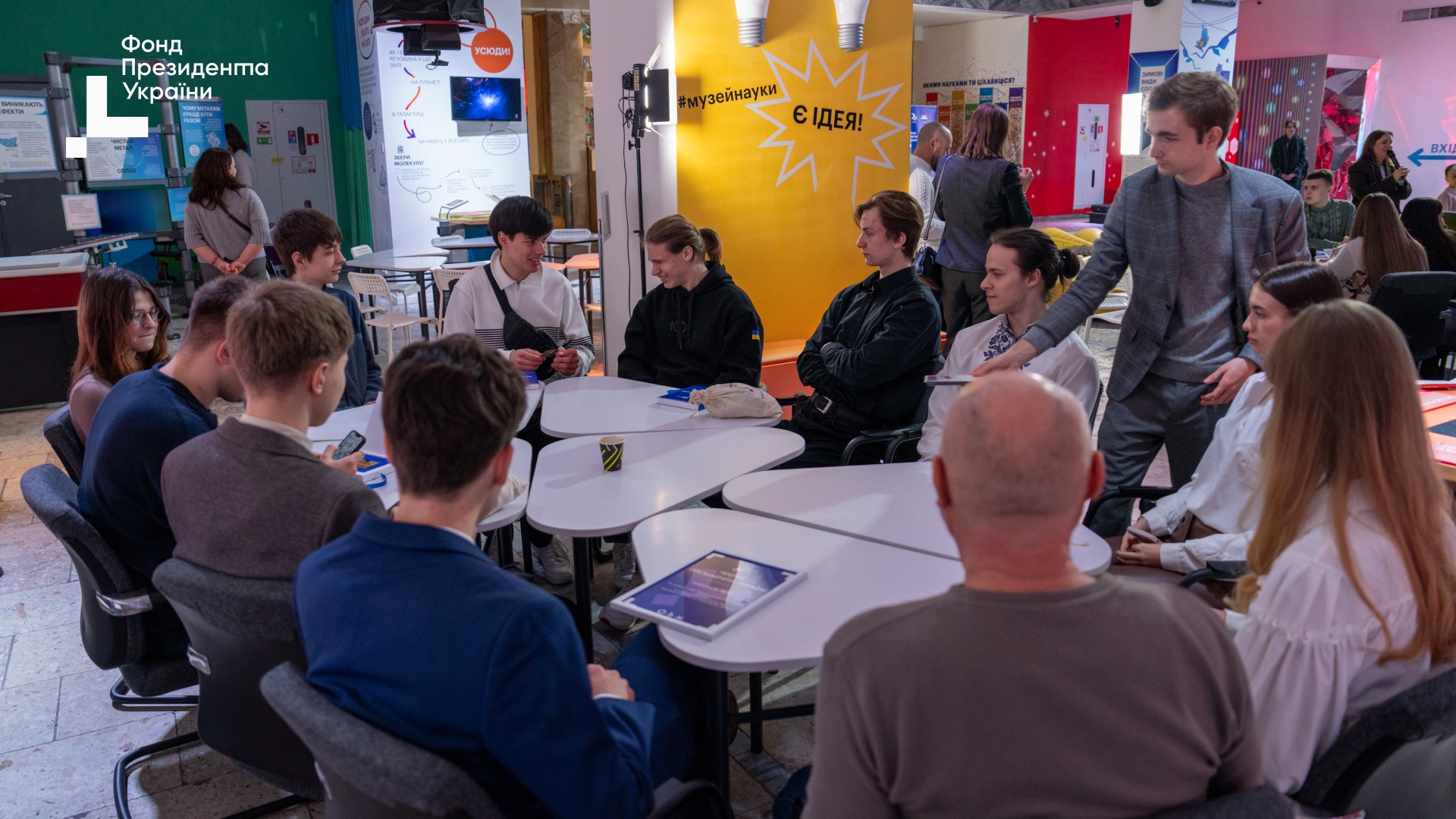 Ці блискучі результати – плід наполегливої праці учнів, підтримки батьків та щоденної титанічної роботи педагогів і тренерів УФМЛ, які формують покоління майбутніх українських науковців. З вітальним словом до стипендіатів звернулася Ольга Будник, Радниця-уповноважена Президента України з питань Фонду Президента. Вона підкреслила важливість того, щоб українські таланти залишалися вдома і своєю працею розвивали державу: «Ваші досягнення – це результат великої роботи, помноженої на виклики воєнного часу. Сьогодні ми відстоюємо країну, і вдячні нашим захисникам за те, що можемо бути тут. Ми хочемо бачити вас тими людьми, які рухатимуть цю країну вперед, та впевнені: Україна потребує саме таких молодих лідерів (…) Навчайтеся, вкладайте час у себе та розвивайте Україну. Як писав Василь Стус: Поки ми тут, все буде добре», – зазначила Ольга Будник. Голова Ради Фонду, Ірина Тулякова, зосередила увагу на системному розвитку спільноти талановитої молоді в Україні: «Підсилюємо талановитих – зміцнюємо Україну. Ви вже сьогодні несете відповідальність за майбутнє. Використовуйте можливості, які створює держава, щоб змінювати країну». Партнери Фонду також представили нові напрямки підтримки молоді та освітніх ініціатив. Зокрема, МАН України анонсувала запуск художньо-естетичного, патріотичного та туристично-краєзнавчого напрямків з 2026 року. Представники Sense Bank підкреслили значення постійної праці, підтримки родин і вчителів у досягненнях юних науковців. Після урочистої частини учасники долучилися до інтерактивної сесії «Стіл ідей: будуємо спільноту», де у форматі «світового кафе» обговорювали візії розвитку науки та освіти в Україні. Завершився день науковими екскурсіями просторами Музею Науки та Музею Математики.