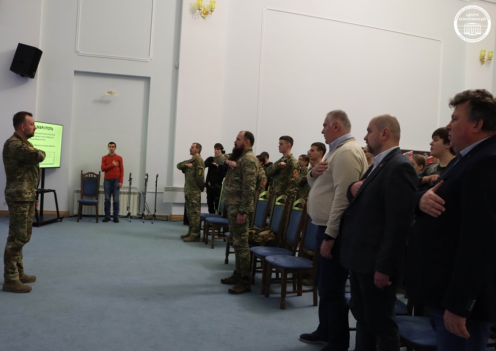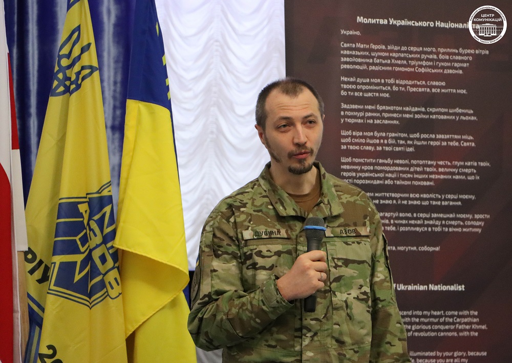 Презентація розпочалася з повідомлення, оприлюдненого 24 лютого 2022 року близько 14:00: Виставка є простором пам’яті героїв, які віддали життя за свободу України, за право жити у вільній державі та за захист цивілізаційних цінностей. В експозиції представлено понад 300 портретів азовців – незламних оборонців Маріуполя й «Азовсталі», а також 26 портретів білоруських добровольців, які загинули, воюючи пліч-о-пліч з українцями. Кожен портрет – це не лише обличчя, а історія мужності, самопожертви й усвідомленого вибору. Автором виставки є етнічний білорус, чий син Євген «Мальдер» Логінов загинув, захищаючи Маріуполь. Через біль особистої втрати він створив місце спільної пам’яті – для родин загиблих, побратимів та всіх, хто прагне осмислити ціну свободи. Ініціативу родини підтримала громадська спілка «Білоруська спільнота України». Виставку презентував її керівник Олексій Францкевич. У заході взяли участь рідні загиблих захисників, побратими по службі, представники полку «Азов», білоруські добровольці, курсанти Військового інституту КНУ, студенти та викладачі університету. «У серці незламної столиці, в серці незламної України ми вшановуємо героїв Маріуполя, – звернувся до учасників заходу ректор Університету Володимир Бугров. – У коридорах КНУ ви теж зможете побачити портрети славетних азовців, які віддали життя за Батьківщину. Це Дмитро «Слендер» Губарев, випускник Філософського факультету, який загинув 15 квітня 2022 року, захищаючи Маріуполь. Та Ярослав «Фірст» Отрок, студент Філософського факультету, який загинув в ніч на 29 липня 2022 року в колонії в Оленівці – під час російського теракту, що забрав життя десятків українських військовополонених азовців – захисників Маріуполя». Ректор окремо відзначив внесок білоруських добровольців, які, захищаючи Україну, водночас боронять і майбутнє своєї країни. Він також зауважив, що мортиролог Університету зростає: нещодавно стало відомо про загибель студента коледжу геологорозвідувальних технологій КНУ Нікіти Рубцова – це вже 21-й університетський захисник, якому не судилося отримати диплом. «Тож ми мусимо зробити все від нас залежне, щоб їхня мрія про вільну Україну здійснилася», – підкреслив ректор. За словами Олексія Францкевича, статистика участі білорусів у російсько-українській війні є показовою: двоє з них стали посмертними Героями України, четверо – народними героями, іменами шістьох названі вулиці українських міст. За чисельністю серед іноземців білоруські добровольці – другі у лавах Збройних сил України. Азовець із Білорусі Дмитро «Ньома» Тесленок наголосив, що для нього «великий гонор – захищати Україну, бути на боці правди й справедливості», закликав пам’ятати тих, які «гідно воювали – гідно загинули». У презентації також узяв участь Данило Давиденко – брат загиблого захисника Маріуполя Дениса «Френка» Комара. Він поділився особистими спогадами та болем втрати, водночас наголосивши, що «віддавати себе болю – це бездіяльність», і розповів про свою роботу з меморіалізації пам’яті захисників Маріуполя. Дуже цінно, що до заходу долучилися й самі бійці полку «Азов». Артем «Нікополь» Дубина пройшов битву за Маріуполь та полон, нині продовжує воювати. У своєму слові подякував Університетові за тих випускників, своїх побратимів та посестер, яких знає особисто. 