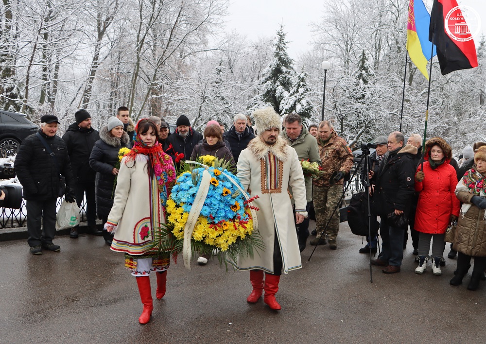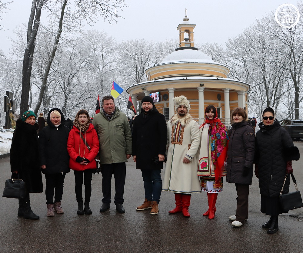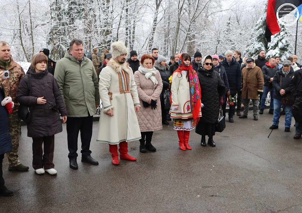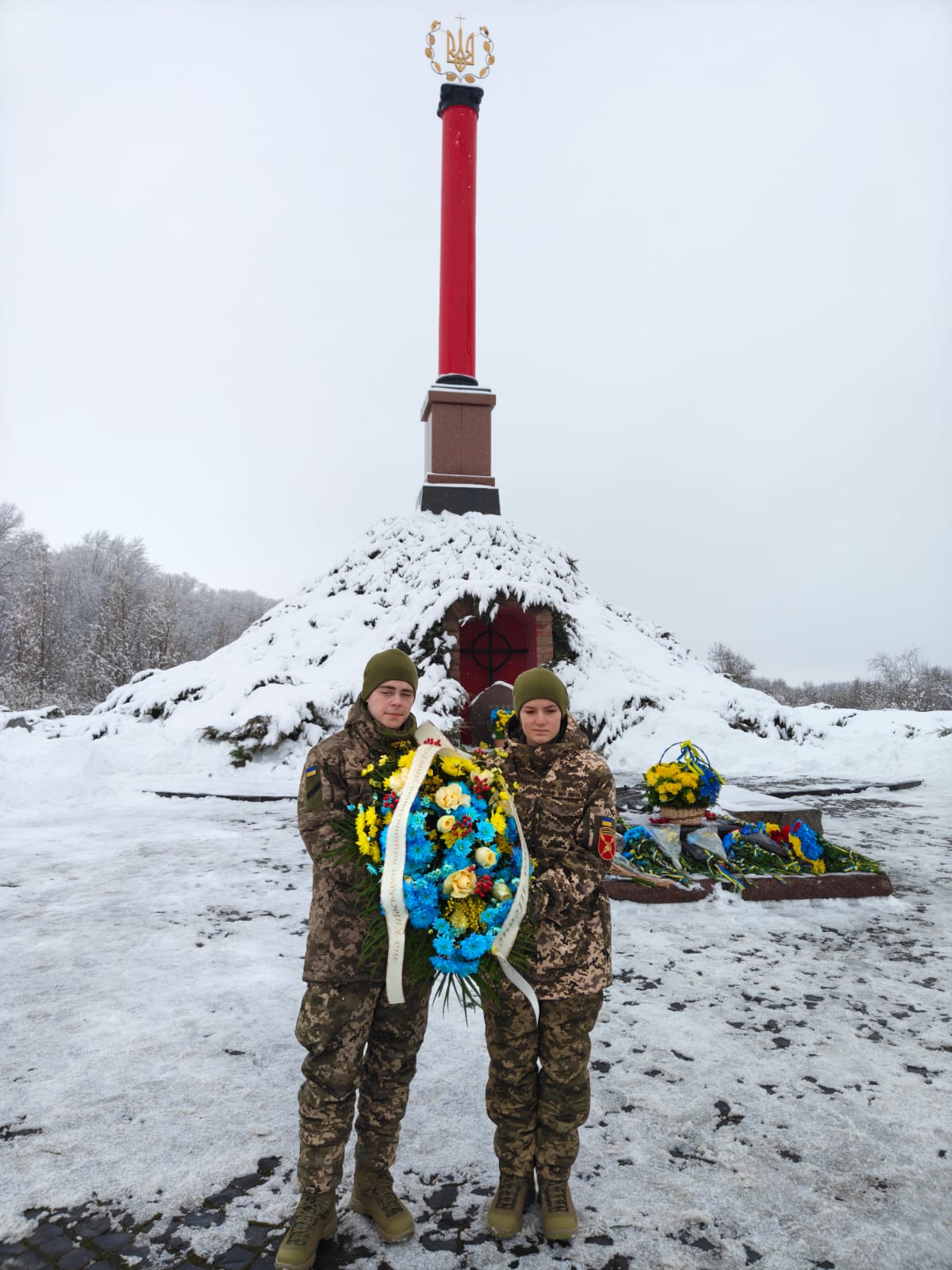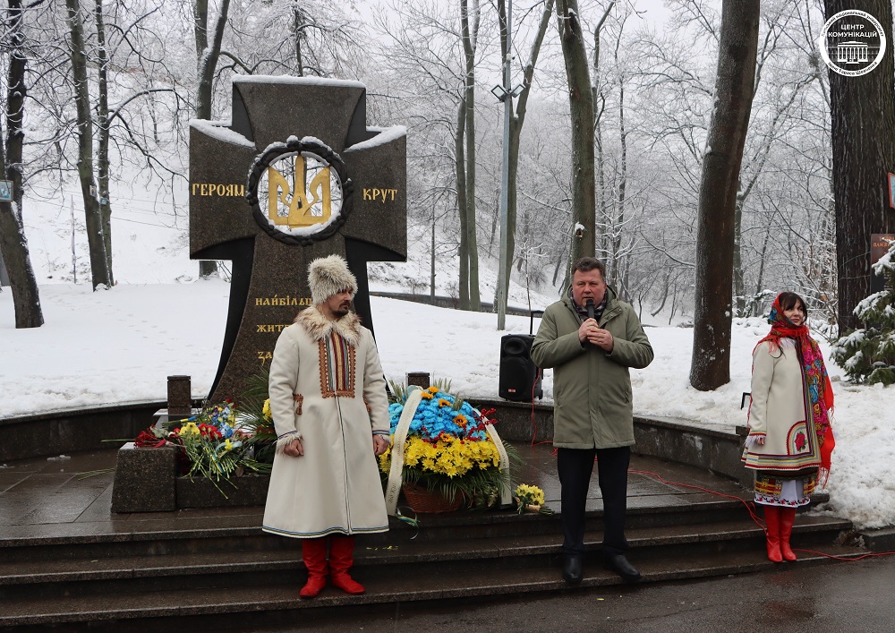 Зранку одна з делегацій вирушила до меморіального комплексу «Пам’яті Героїв Крут» на Чернігівщині  безпосереднього місця історичного бою. Представники Центру соціального розвитку КНУ, курсанти та співробітники університету на чолі з проректором з гуманітарних питань Тарасом Компанцем.