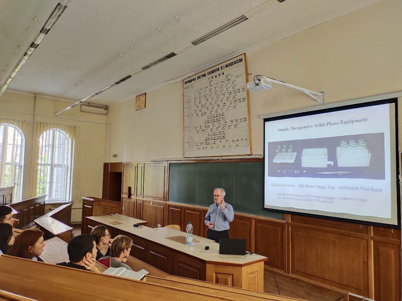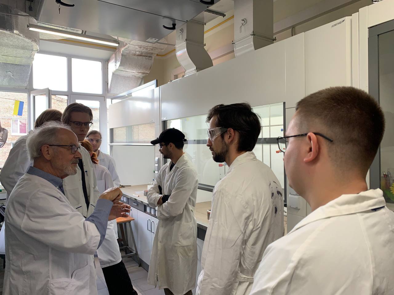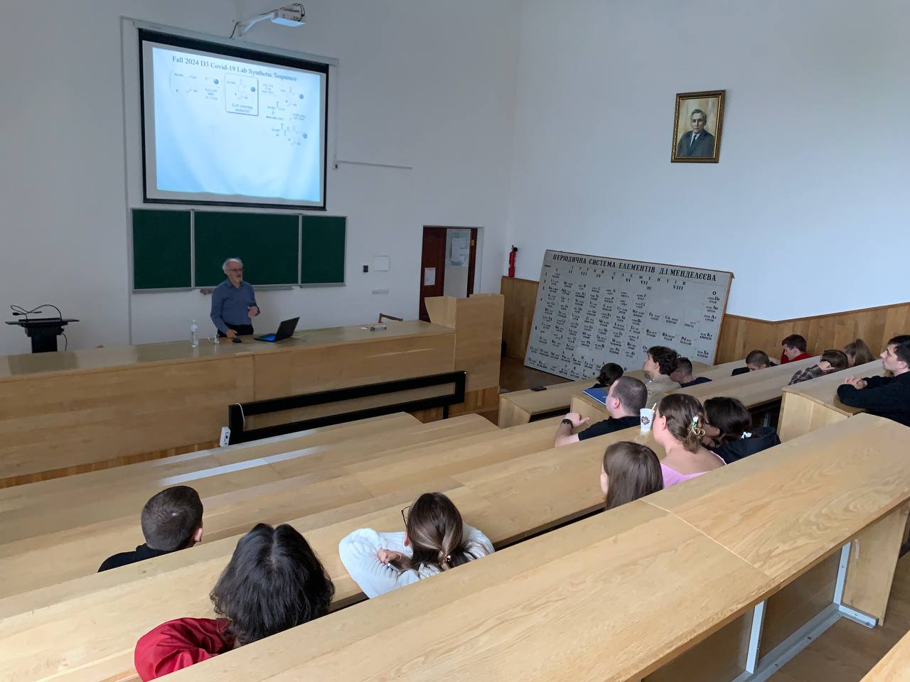 КНУ імені Тараса Шевченка продовжує розширювати міжнародну академічну співпрацю навіть в умовах повномасштабної війни. Яскравим прикладом такої взаємодії стало впровадження на кафедрі органічної хімії Хімічного факультету інноваційної освітньо-наукової методології D3 Lab (Distributed Drug Discovery) за підтримки професора Вільяма Скотта з Indiana University Indianapolis (IUI), США. Співпраця з професором Вільямом Скоттом розпочалася кілька років тому – після початку повномасштабного вторгнення Росії в Україну. Усвідомлюючи несправедливість агресії проти незалежної української держави та щиро захоплюючись стійкістю викладачів і студентів КНУ, професор Скотт запропонував завідувачу кафедри органічної хімії професору Олександру Григоренку підтримку у вигляді циклу лекцій з комбінаторної хімії та твердофазного синтезу в межах дисципліни «Методологія органічного синтезу» для магістрантів кафедри. Наступним кроком цієї співпраці стала ініціатива впровадження методології D3 Lab, розробленої професором Скоттом у Indiana University та успішно апробованої в університетах США, Польщі, Куби, Мексики, Іспанії та Чехії. Концепція лабораторії ґрунтується на принципах комбінаторної хімії та твердофазного синтезу, які дозволяють з обмеженої кількості «будівельних блоків» створювати бібліотеки нових хімічних сполук – підхід, що широко застосовується у сучасній фармацевтичній науці. Методологічні засади D3 Lab формувалися під впливом професійного досвіду професора Скотта. У співпраці з професором Мартіном О’Доннелом була створена освітня модель, у межах якої студенти синтезують бібліотеки ацильованих неприродних амінокислот та проміжних сполук, що згодом тестуються як потенційні лікарські засоби, зокрема для лікування COVID-19, інфекційних і рідкісних (орфанних) захворювань. Попри воєнні ризики та складну безпекову ситуацію, на початку вересня 2025 року професор Вільям Скотт особисто відвідав Київ, щоб долучитися до запуску D3 Lab у КНУ. Цьому візиту передувала масштабна підготовча робота: консультації з українськими колегами, розробка методичних матеріалів, запис відеолекцій та презентацій щодо досвіду впровадження D3 Lab в Indiana University Indianapolis. Разом із колегами Джино Самарітоні та Анжелою Магалетті, а також за сприяння науково-виробничого підприємства Enamine Ltd, професор Скотт забезпечив лабораторію необхідним обладнанням для мікромасштабного синтезу та аналізу речовин, зокрема наборами Bill-Board, смолами для твердофазного синтезу, хроматографічними мікроколонками та допоміжними матеріалами. Магістранти кафедри органічної хімії КНУ з великим ентузіазмом долучилися до роботи в межах D3 Lab. Уже після кількох лабораторних сесій було отримано перші результати – синтезовано та виділено контрольні сполуки й речовини за вибором студентів, проведено їхній аналіз із застосуванням сучасних фізико-хімічних методів, зокрема ЯМР-спектроскопії та високоефективної рідинної хроматографії. Важливою складовою успіху проєкту став високий рівень володіння англійською мовою магістрантів, що дозволило їм безпосередньо слухати лекції професора Скотта, активно спілкуватися з ним і ставити запитання як під час занять, так і в неформальній атмосфері. Під час перебування в Києві професор також ознайомився з історичними пам’ятками міста, яке справило на нього глибоке враження. Пе